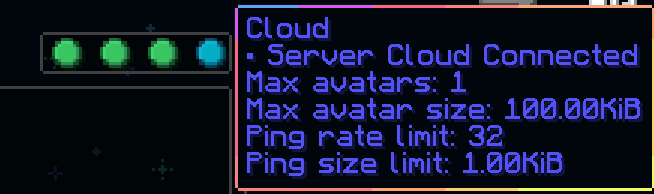 avatarSizeLimit is the maximum number of bytes avatars on the FSB can be,pingsRateLimit is the maximum number of pings players can send per second, andpingsSizeLimit is the maximum size in bytes that pings can be.Connect to a server with the prerelease Figura set up, and open your Figura wardrobe. You should see a blue icon at the top right. Hovering over it should read "Server Cloud Connected", and show information about the FSB.