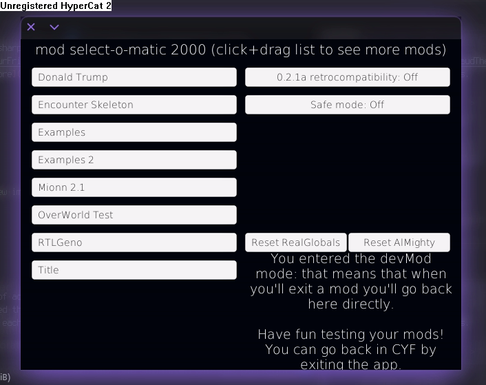 Version 0.6.2 is the first version I worked on. It started my trend of adding a lot of features meant to make creating mods with CYF easier.