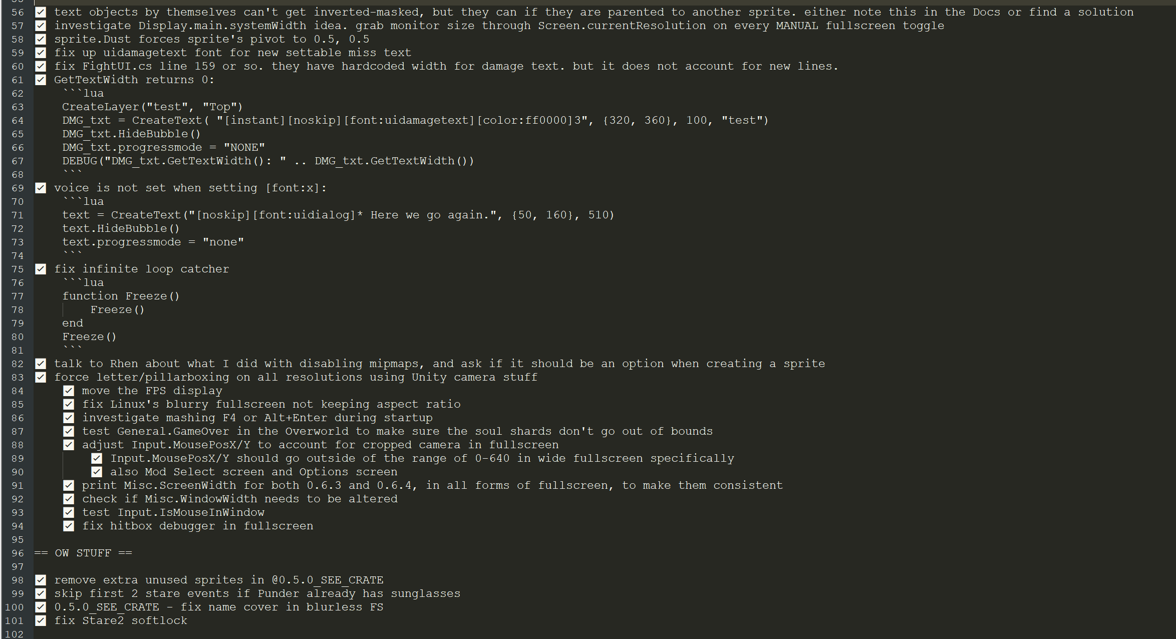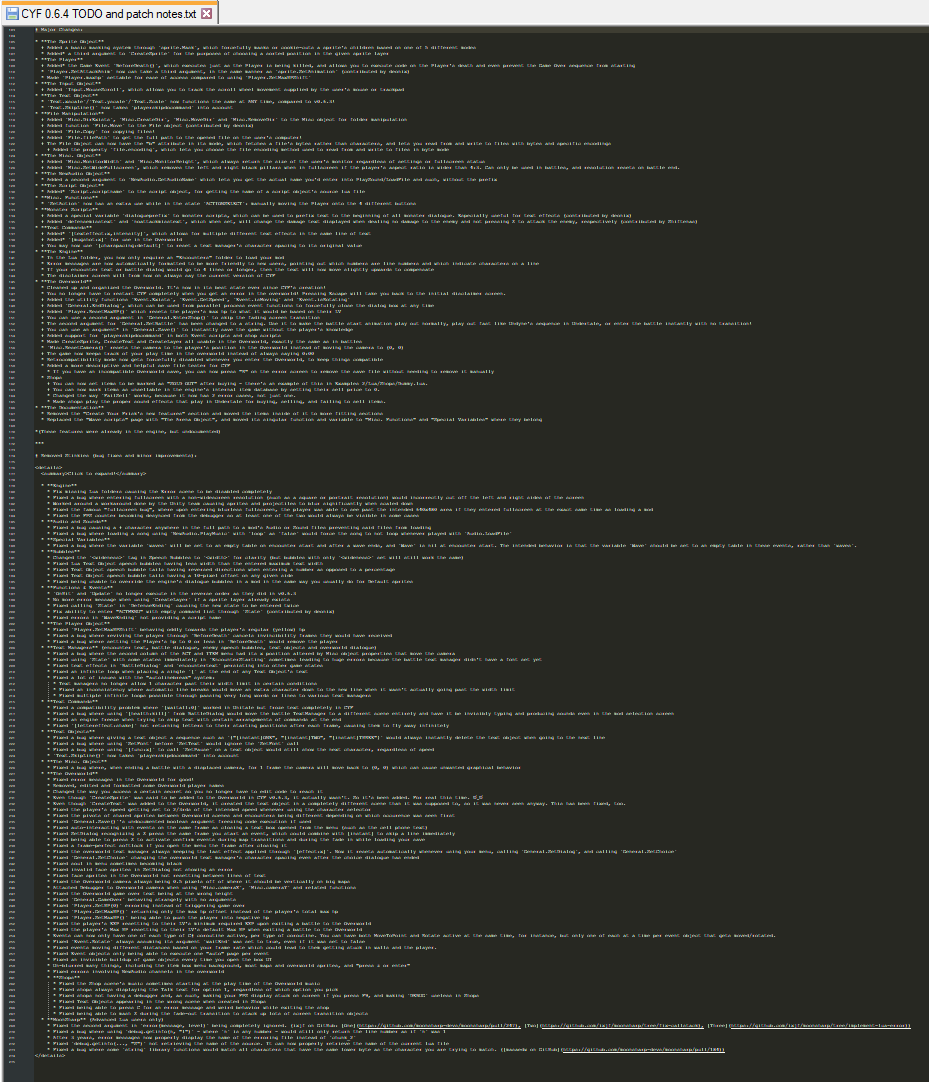 I would maintain a TODO file and a changelog text file, for each version. Sometimes it'd be on discord instead of a file. Rhen and I would sometimes swap the file back and forth, but I was the one to keep track of all the changes. In time, I became the one writing the changelogs - except the flavor text at the top, which is Rhen. We used to do voice calls and screen-sharing to work on CYF.